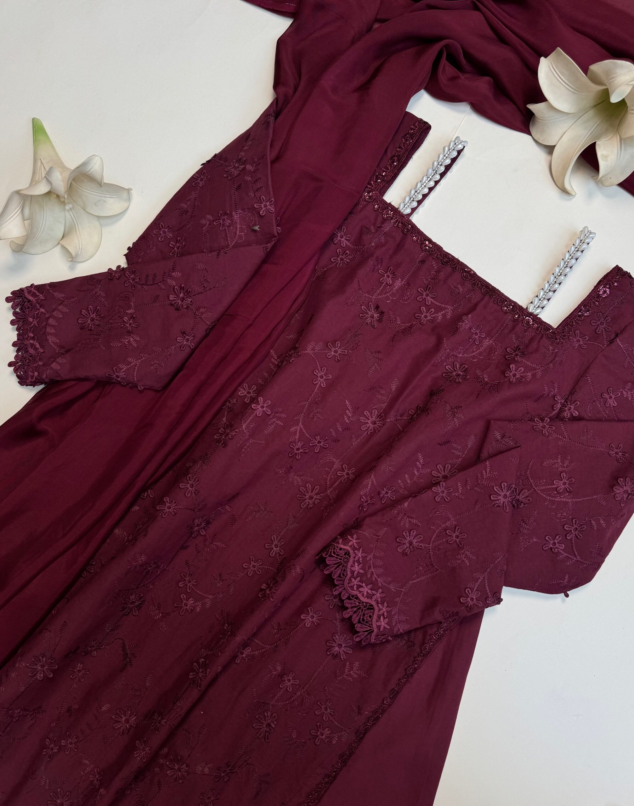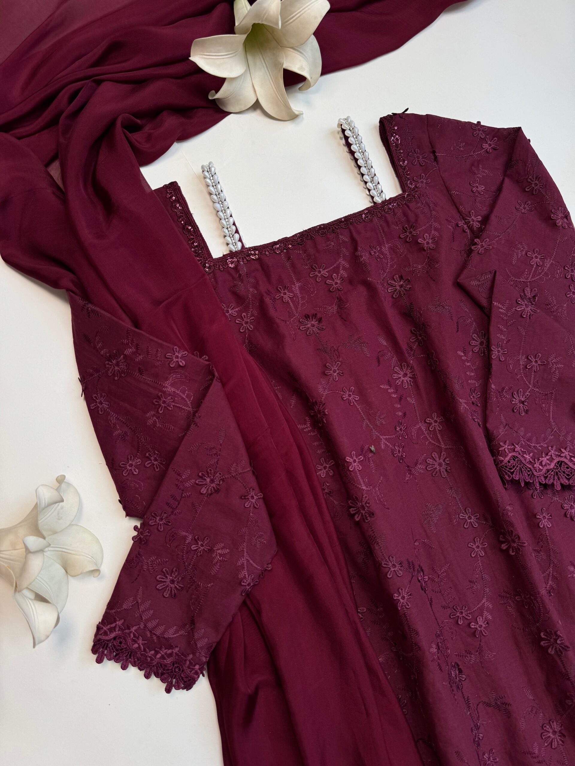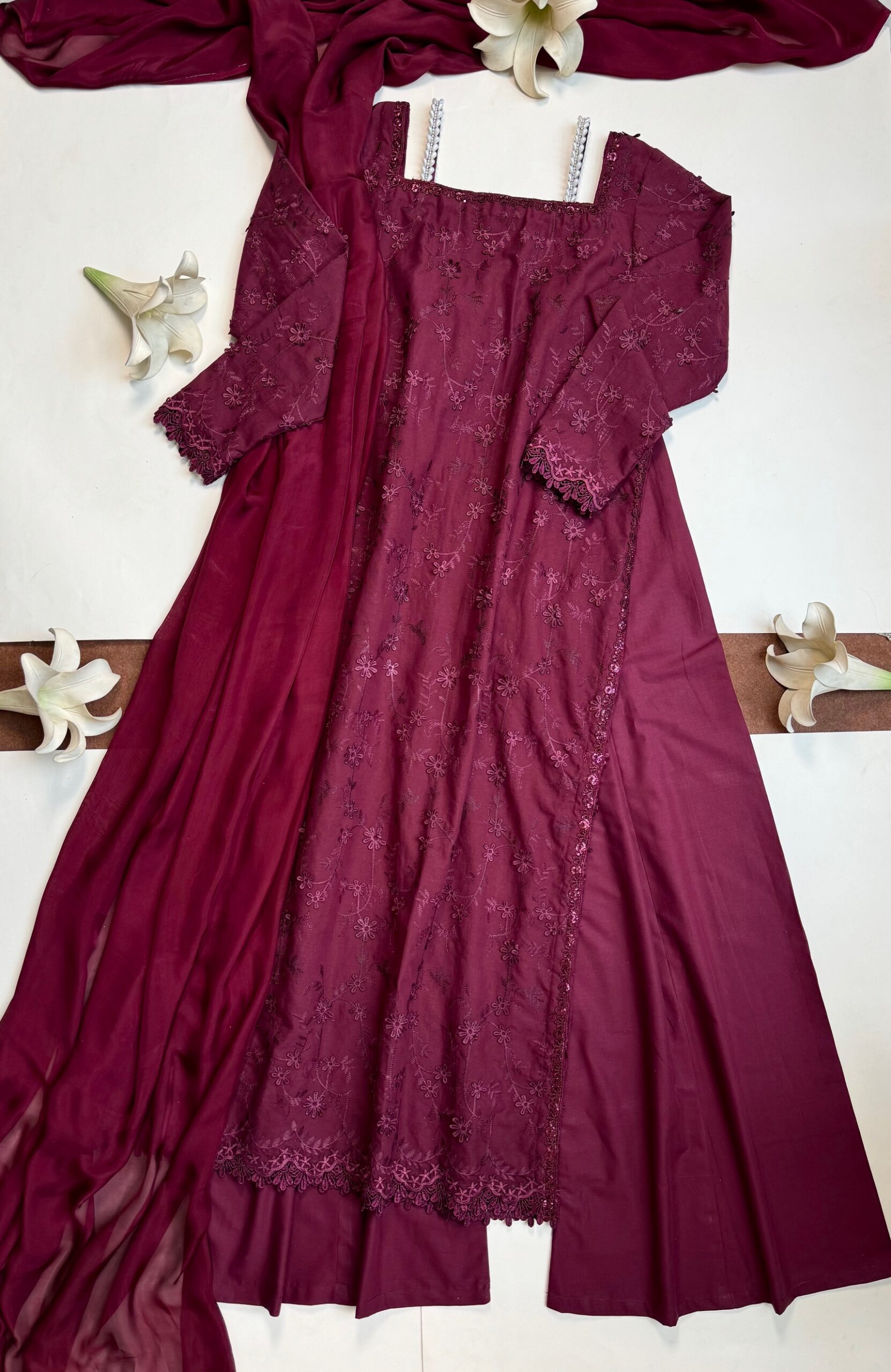 - Description: A long length Lawn chicken embroidered shirt, paired with silk dupatta and cambric panel flared plazzo.