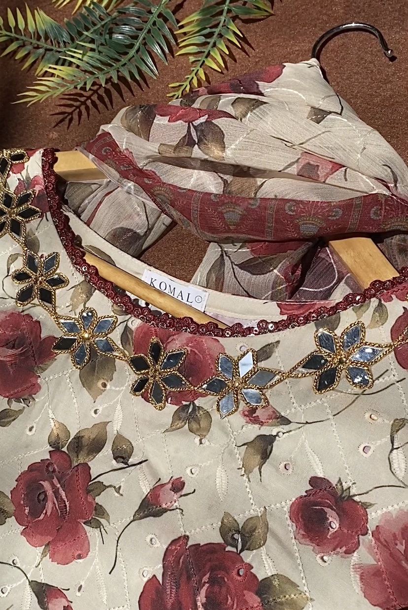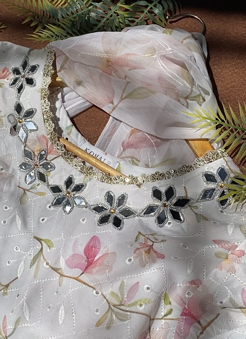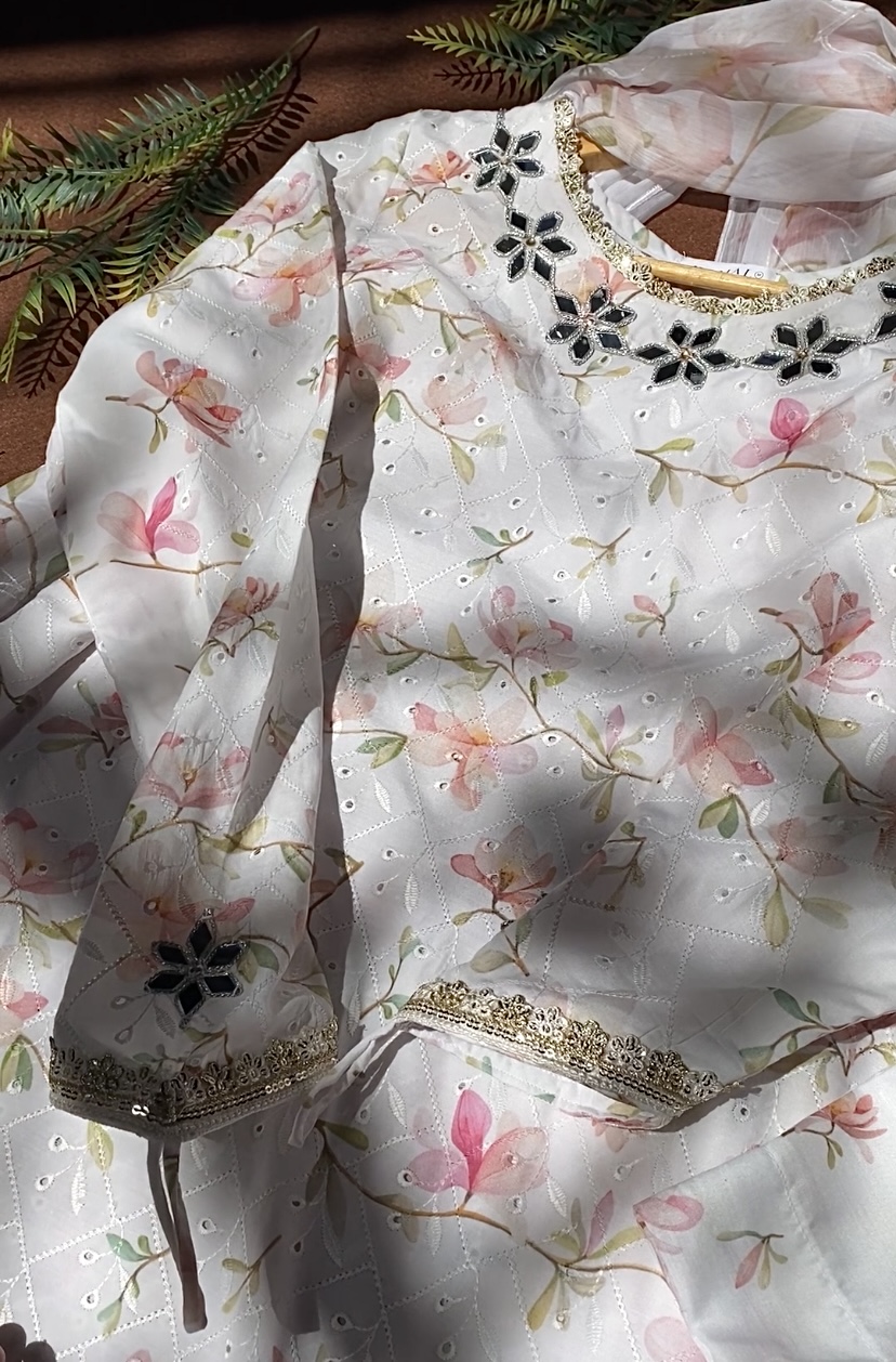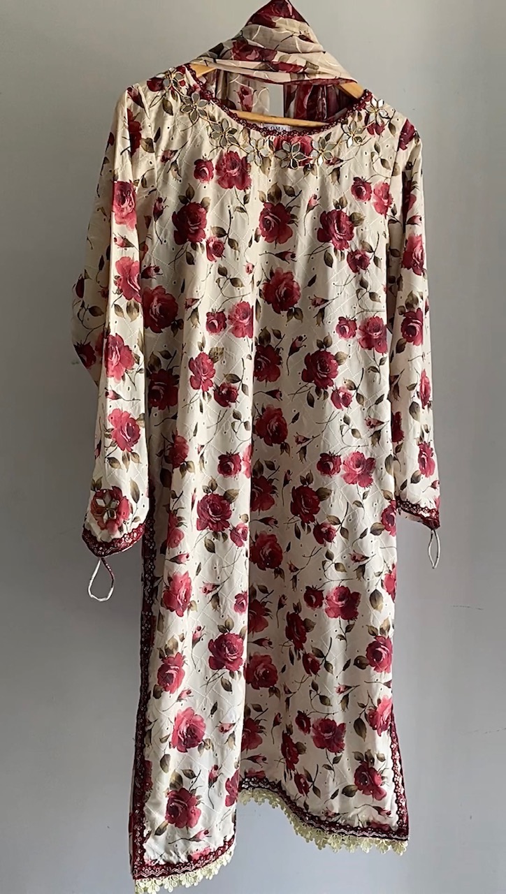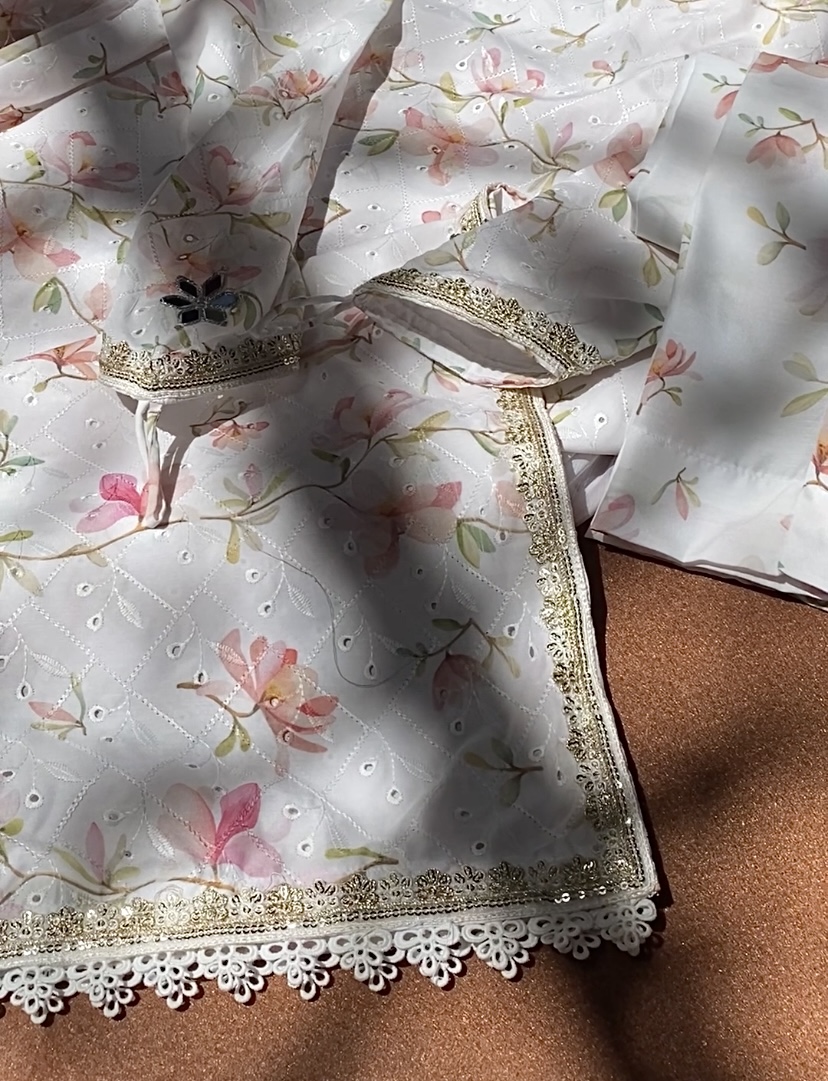 - Description: Lawn printed chickenkari shirt paired with smart pants and chiffon dupatta adorned with printed embroidered chiffon dupatta.