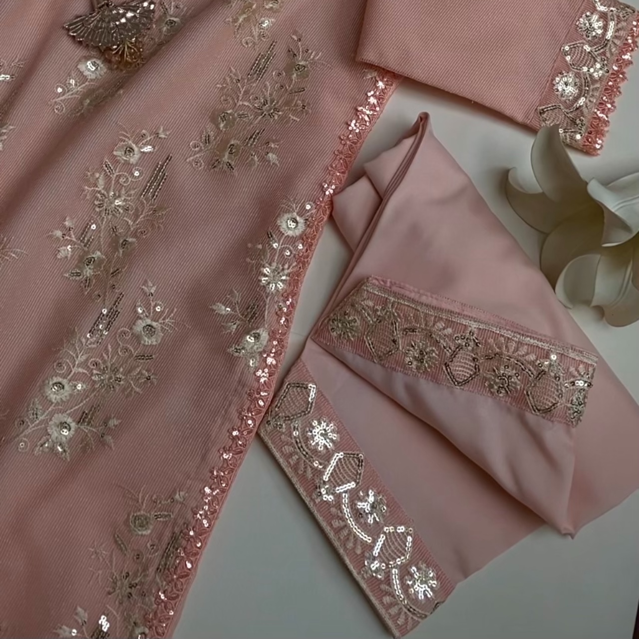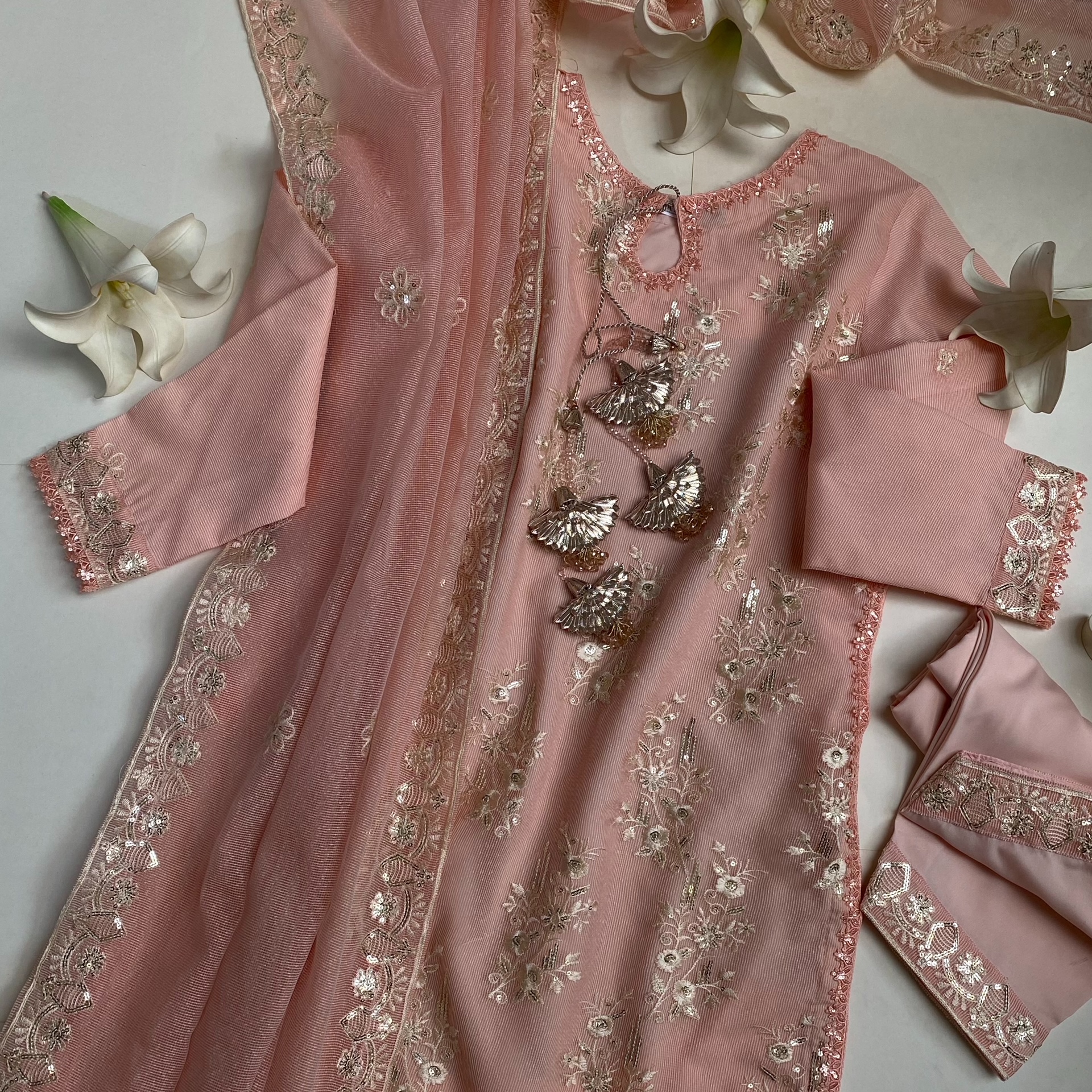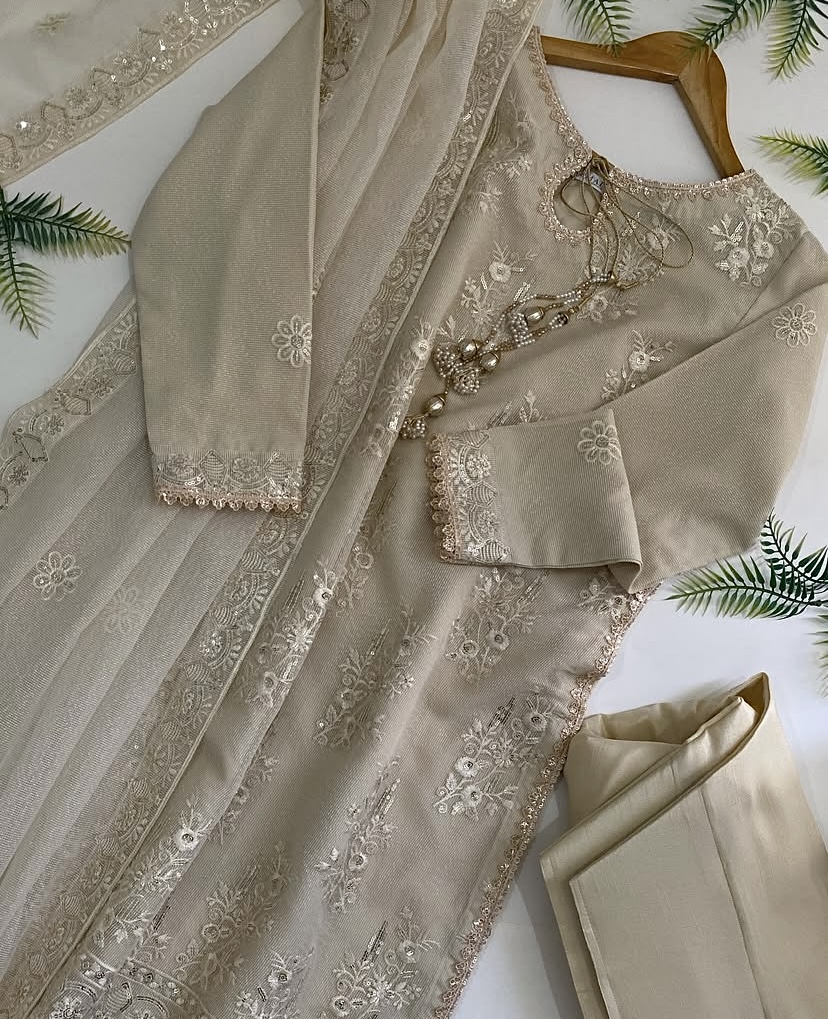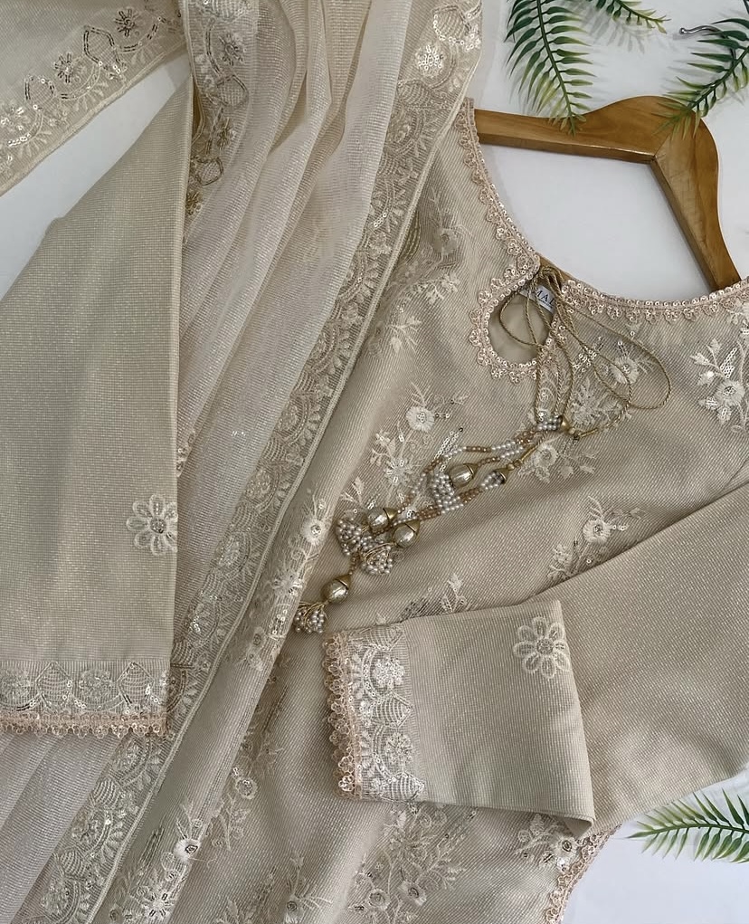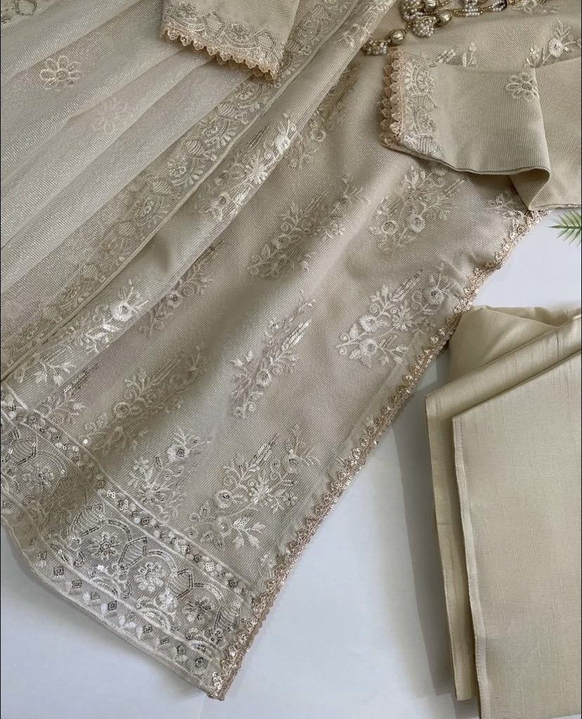 - Description: A short knee length embroidered shirt embellished with sequin lace and gotta phool dori, paired with shalwar and dupatta.